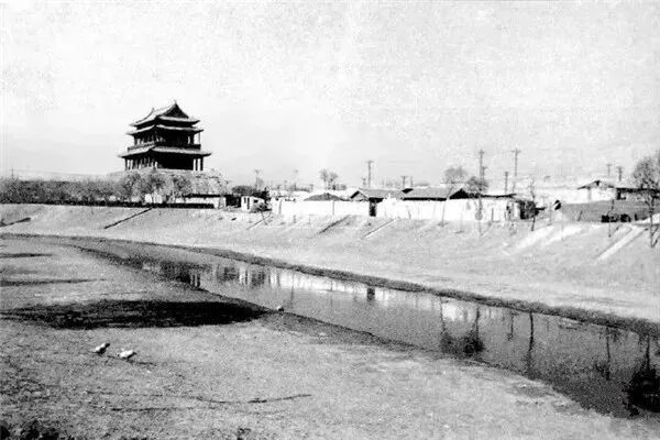 1964年,阜成门以南内城西护城河。已看不到城墙。此照的第二年城楼也被彻底拆除。