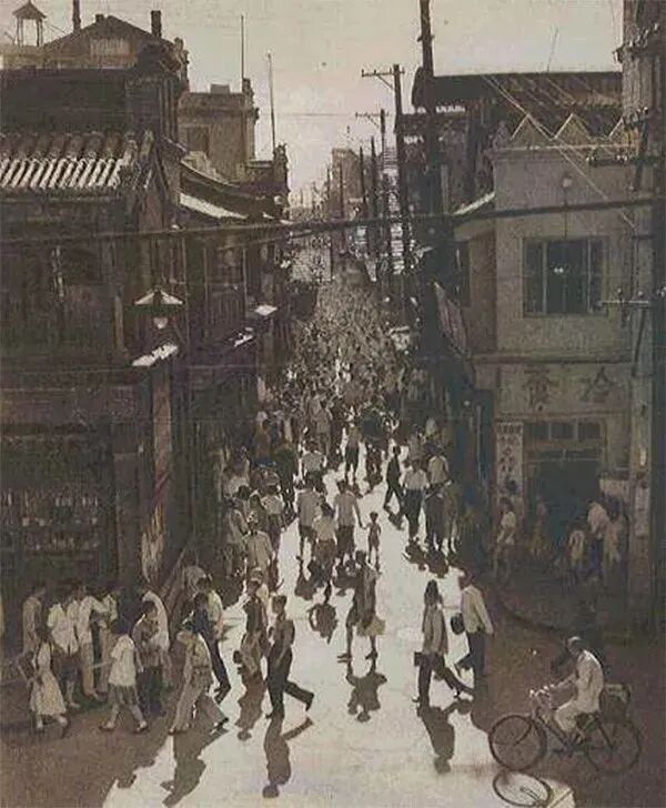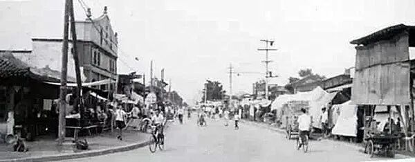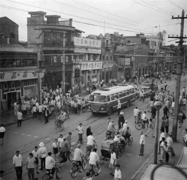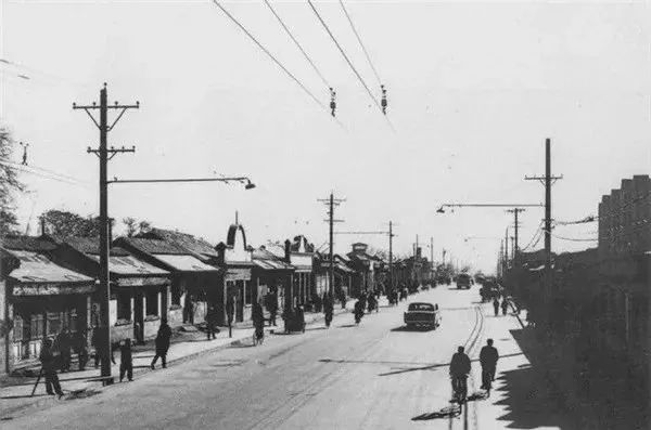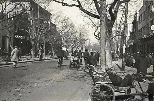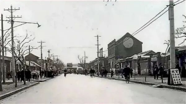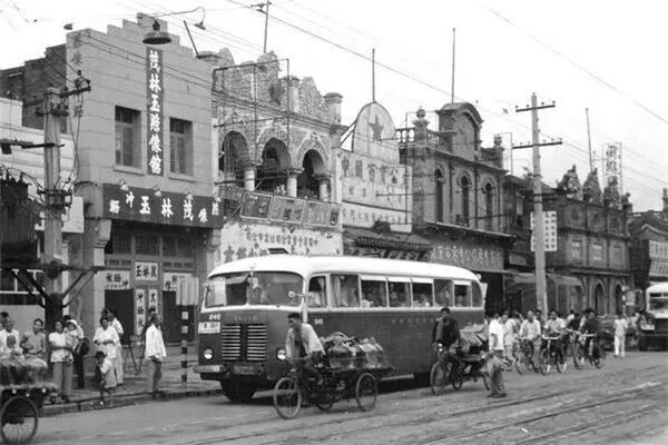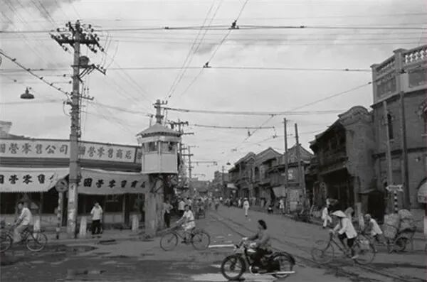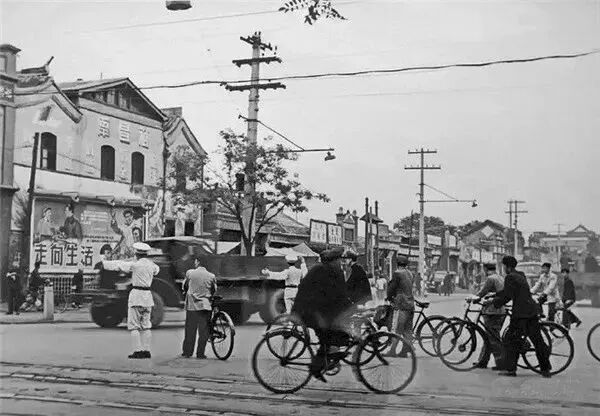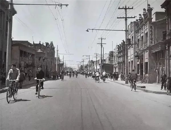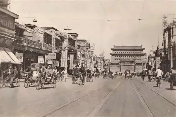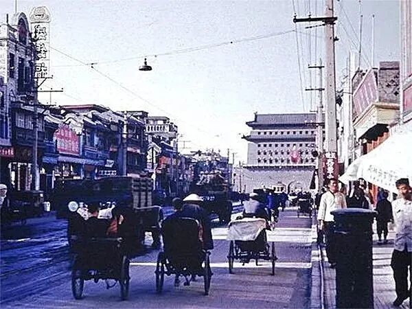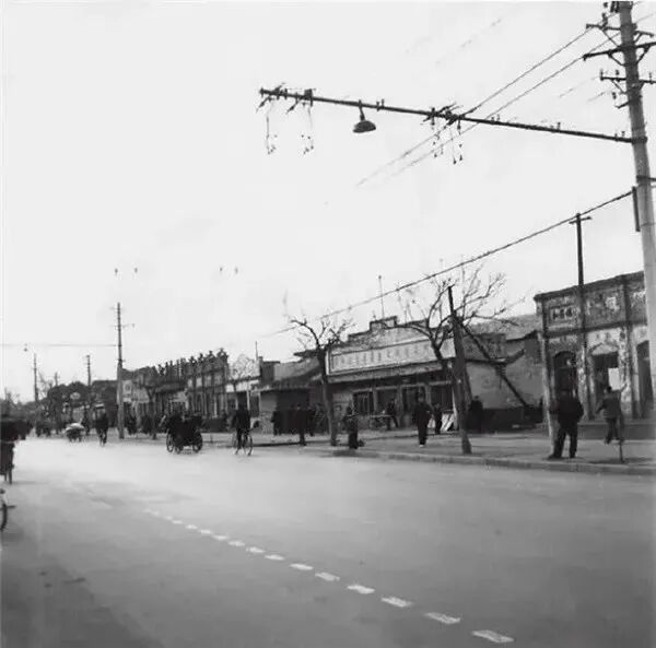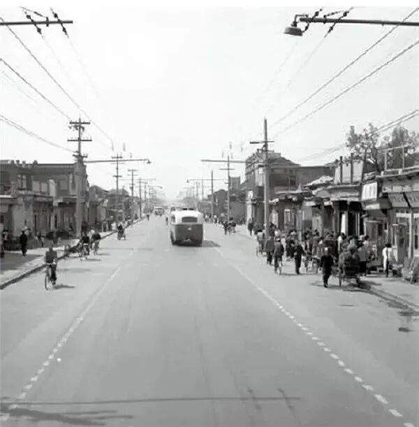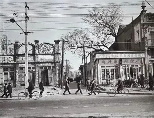 1951年,前门大街北向。可见道路上的交通工具还是以自行车和人力三轮车为主,店铺和幌子还基本保留着民国时的风格。