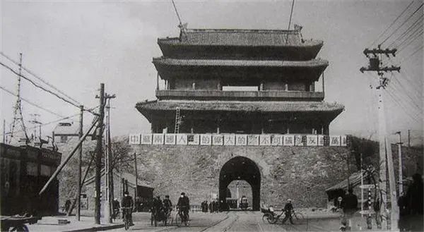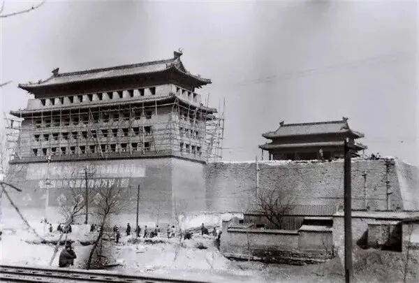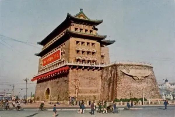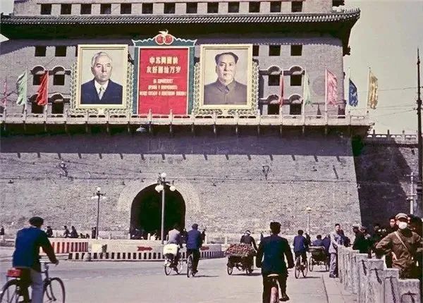 1953年,西直门城楼东面(城里),中苏蜜月期,城楼上的标语口号:“中苏两国人民的伟大的牢不可破的友谊万岁”。