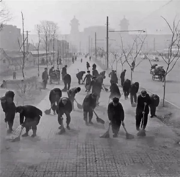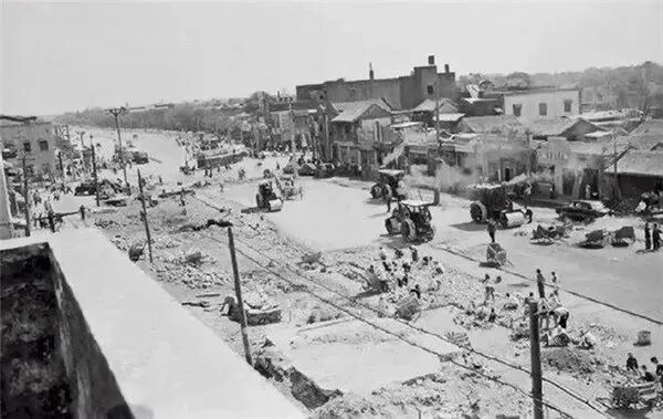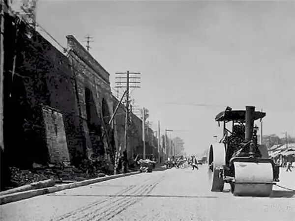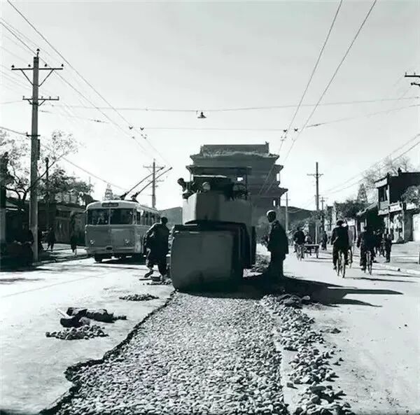 1951年,和平门内侧,前门西顺城街正在铺装路面。远处城门为宣武门。