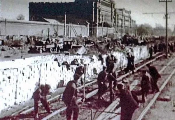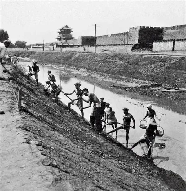 1950年,东直门以北内城东垣外护城河。民工正在疏浚河道和修缮堤岸。