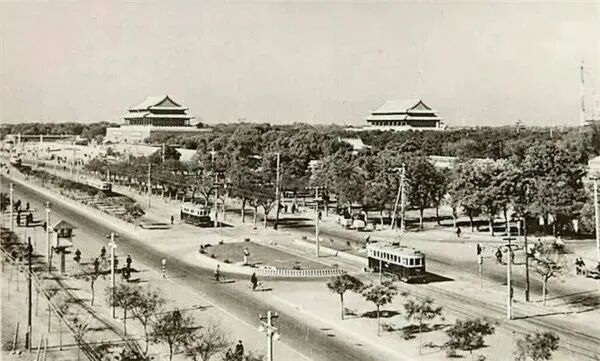 1954年,东长安街南池子路口,长安左、右门和牌楼都已拆除,道路进行了改造和展宽,中间辟为有轨电车道,其它车辆分两侧上下道行驶。