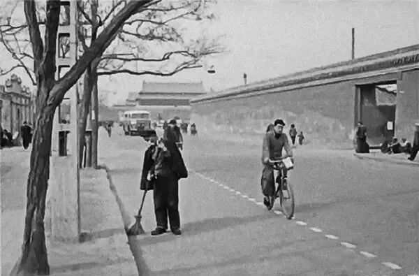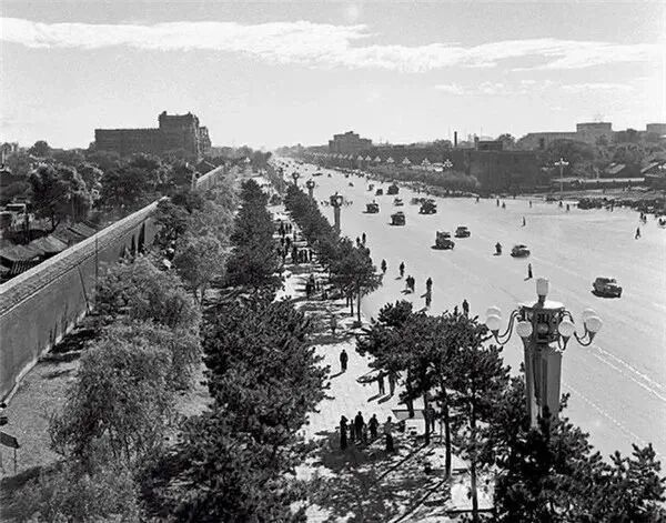 1950年,西长安街六部口路口(府右街南口)北向,可见中南海西南角的皇城墙。