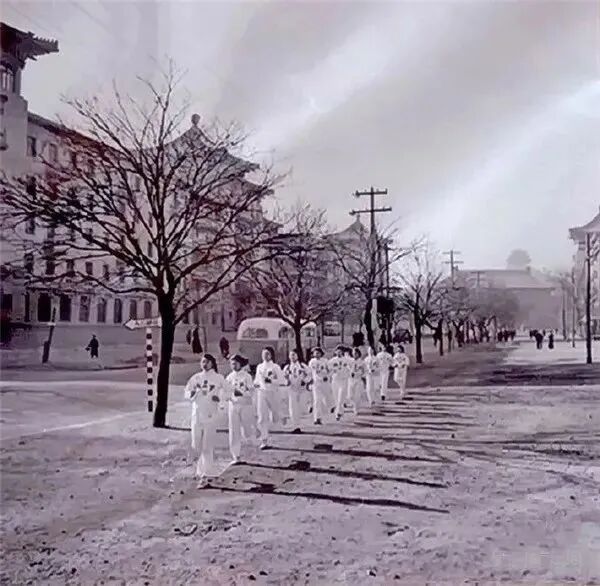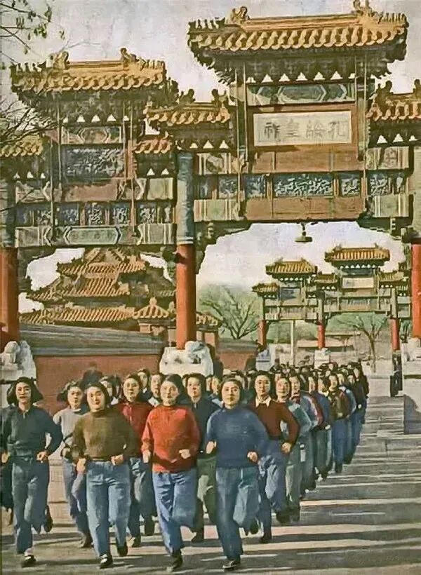 1951年,北京市第一女子中学学生早晨在景山前街跑步锻炼身体,穿过大高玄殿前牌楼(西向)。