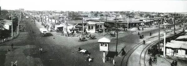 1960年,天桥路口东北向,可见远处的正阳门和拐向金鱼池方向的有轨电车轨道。