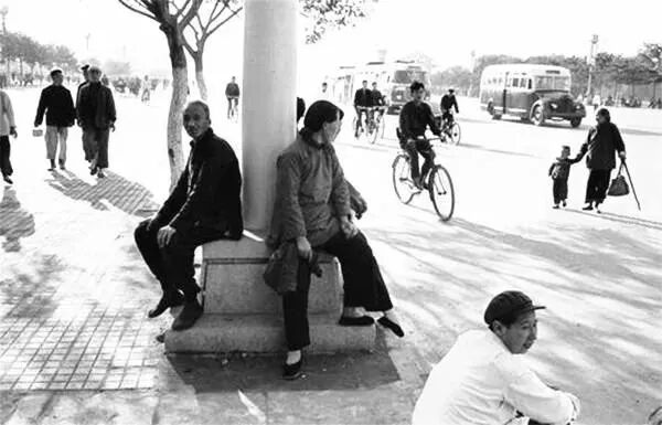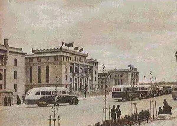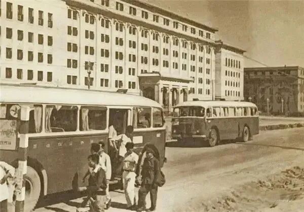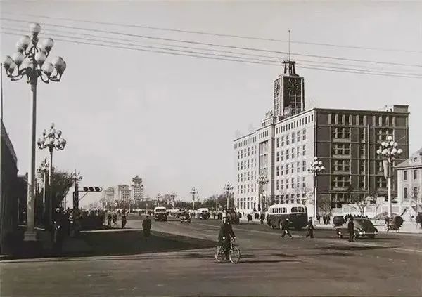 1960年,长安街改造完成,刚栽上行道树,撤除了有轨电车轨道,大会堂和历史博物馆已建成。街上行驶的公共汽车是4路环行和10路,正准备进站(东长安街南河沿)。