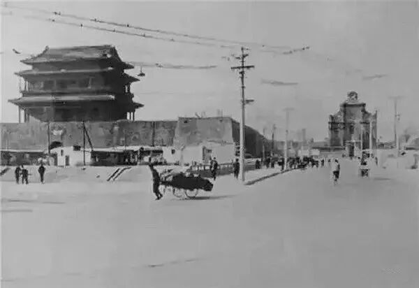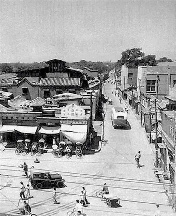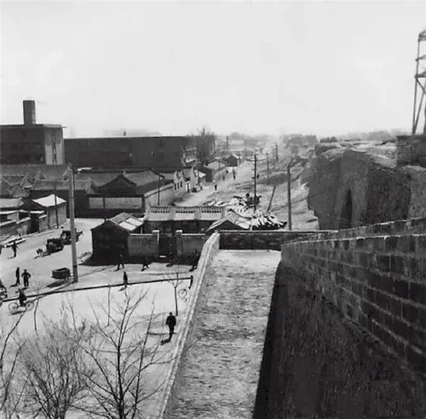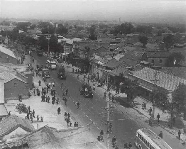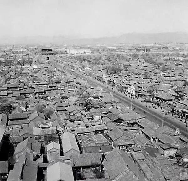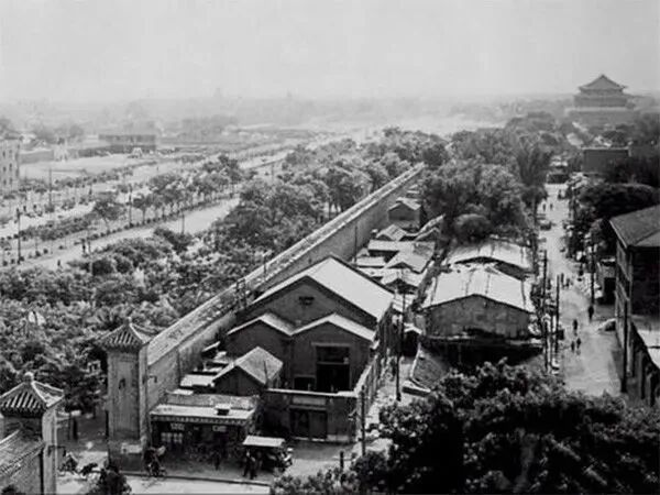 1954年,复兴门内,卧佛寺街(北)和邱祖胡同(南)西口,两年后在这里将开辟出复兴门内大街。东南方向远处可见宣武门城楼和南堂。由复兴门门洞上方城墙上向东拍摄。