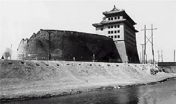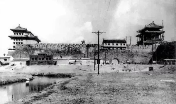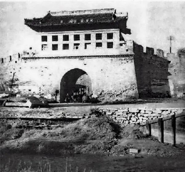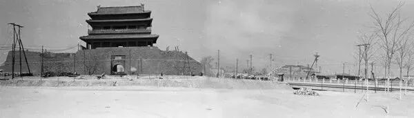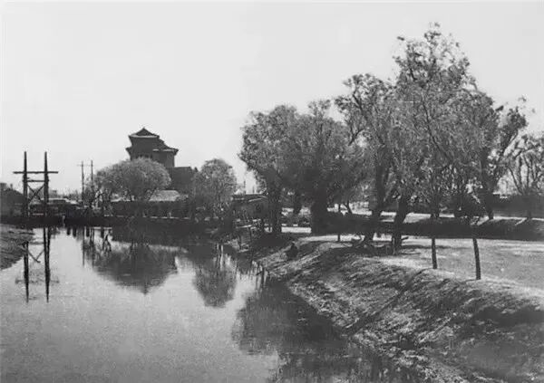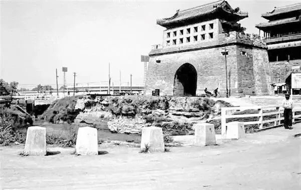 1953年,永定门西侧,拆除瓮城后,城楼两侧已扒开豁口。绕箭楼而过的外城南护城河。