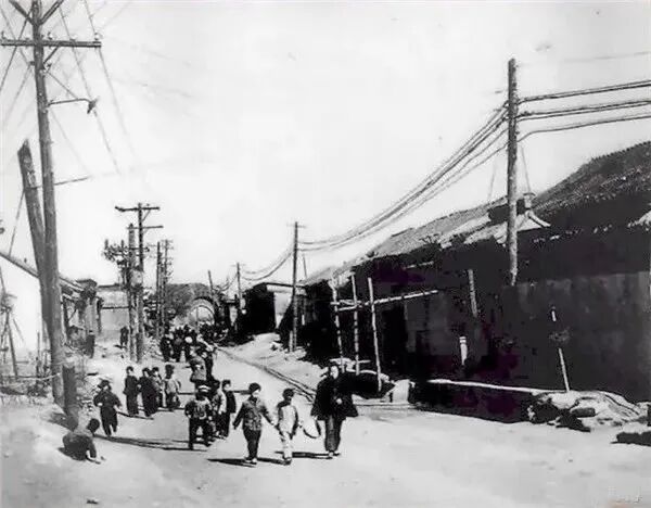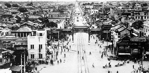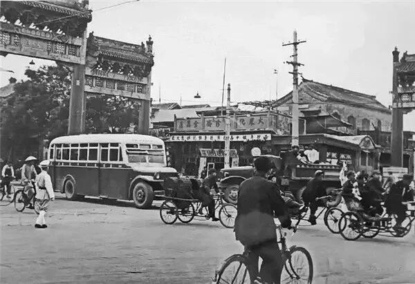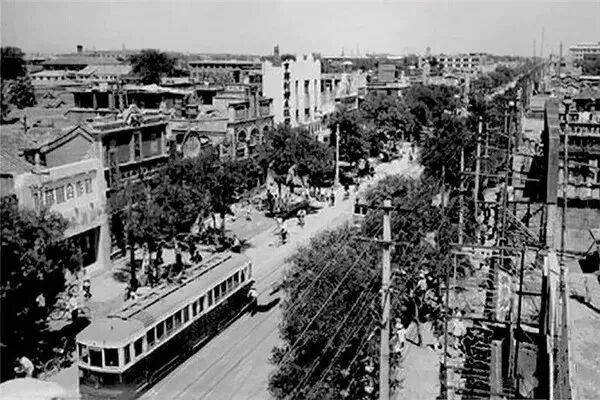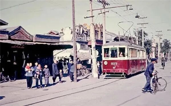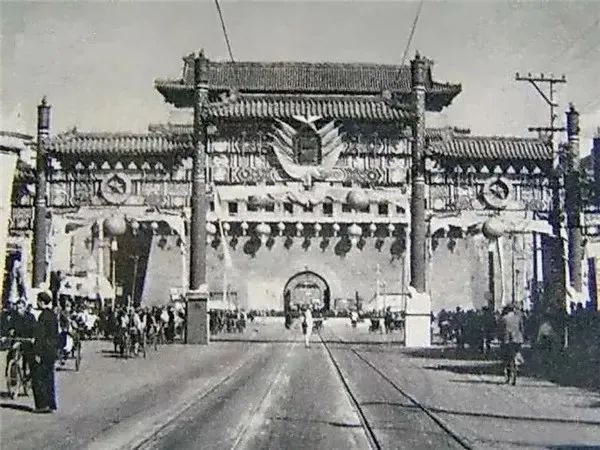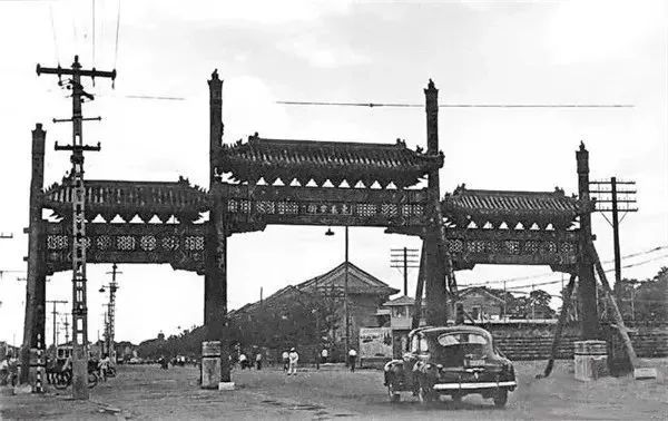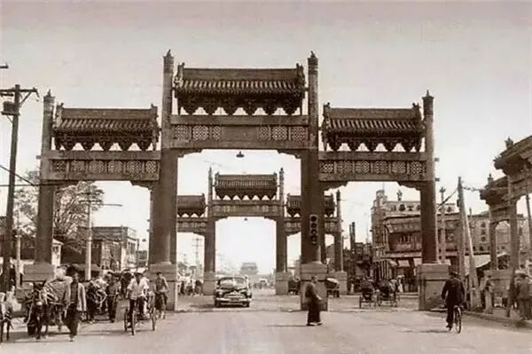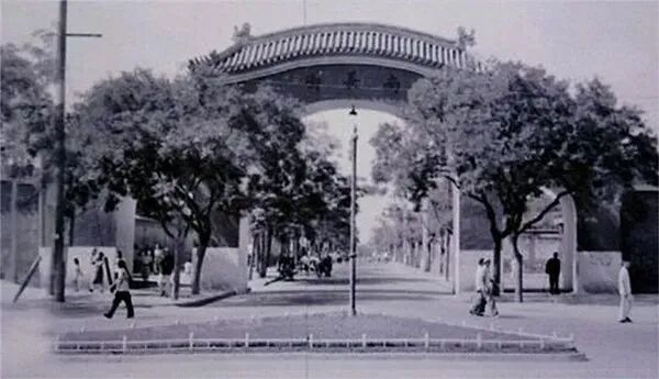 1953年,西四牌楼北向,有轨电车通过北大市街牌楼,画面左侧是转角楼新华书店朝东的铺面房。