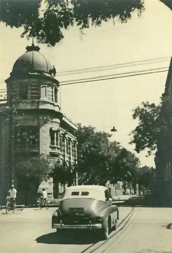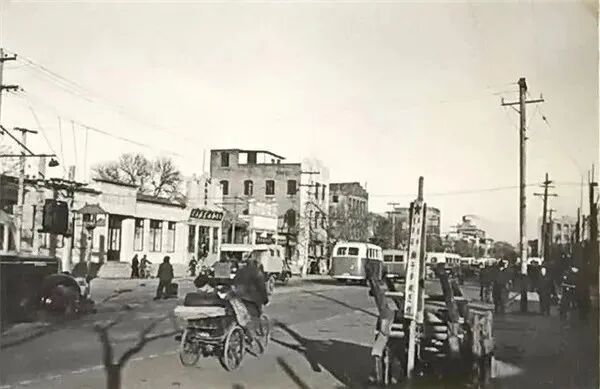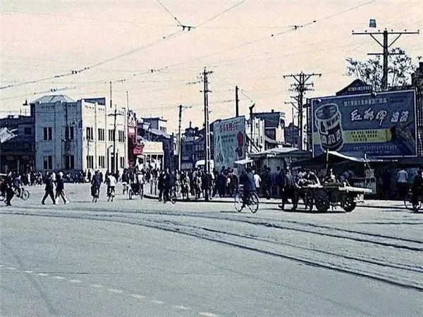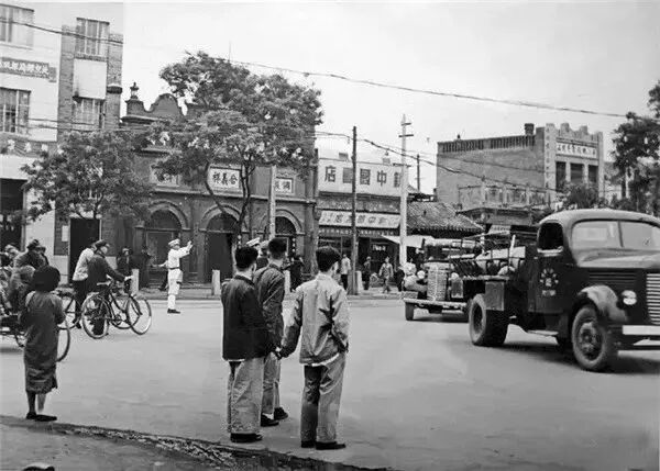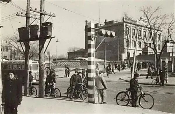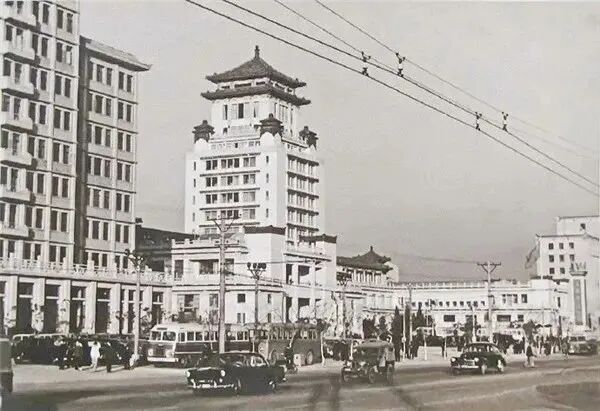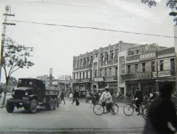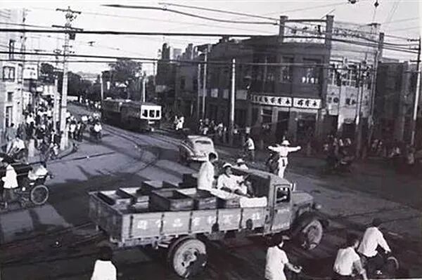 1953年,西单路口东南向。路上的交通工具有1辆日本丰田卡车,波兰华沙20轿车,有轨电车,人力三轮车和自行车。