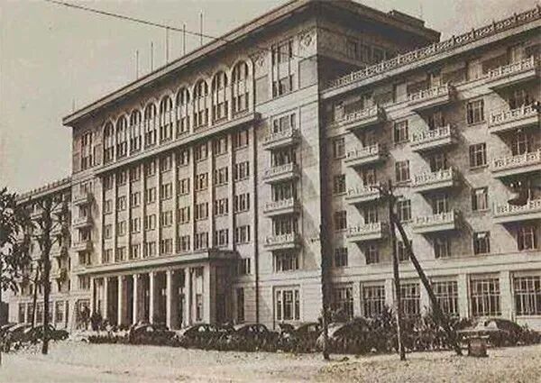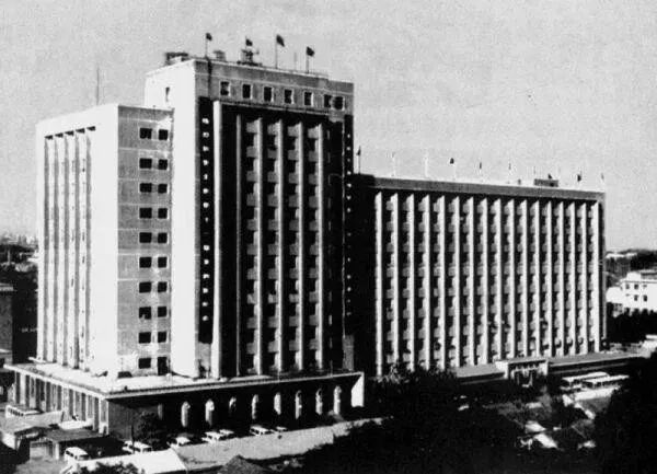 1954年,东长安街南河沿路口,有轨电车在道路中间行驶,新建的北京饭店西楼上烟囱黑烟滚滚,应该是暖气烧煤锅炉冒的烟。