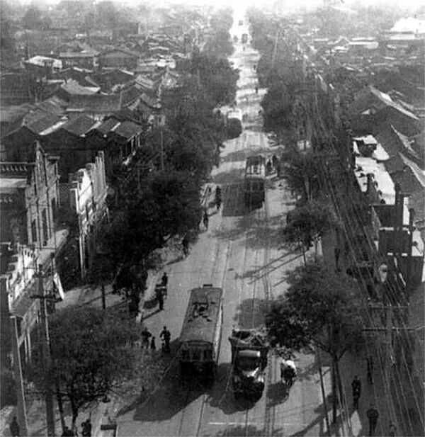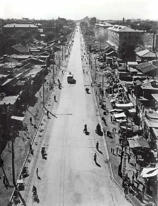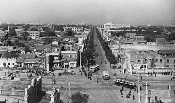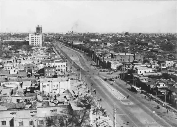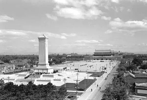 1951年,前门大街南向,京城南中轴线,南端可见永定门城楼。正阳桥五牌楼尚健在,画面左侧白色的三层小楼后来成为了大北照相馆。