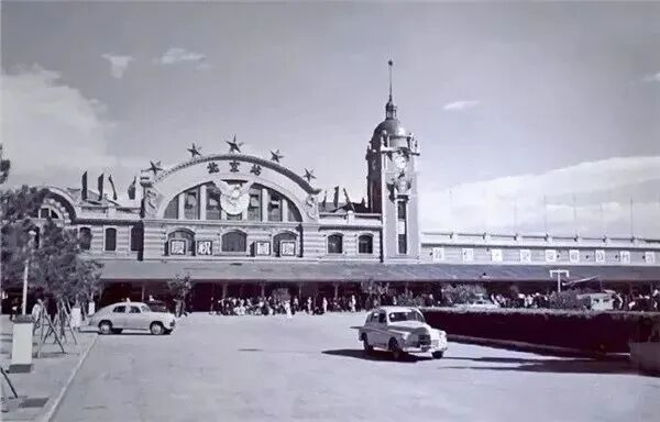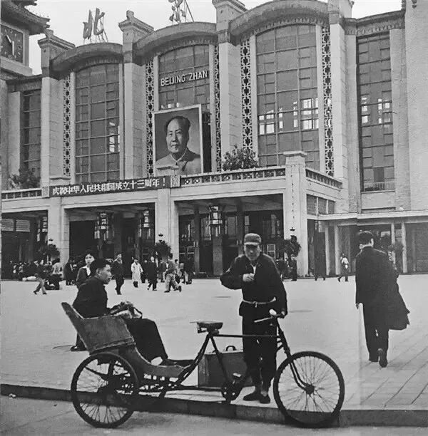 1962年,国庆十三周年期间的北京站前,乘三轮车赶火车的旅客到达车站。