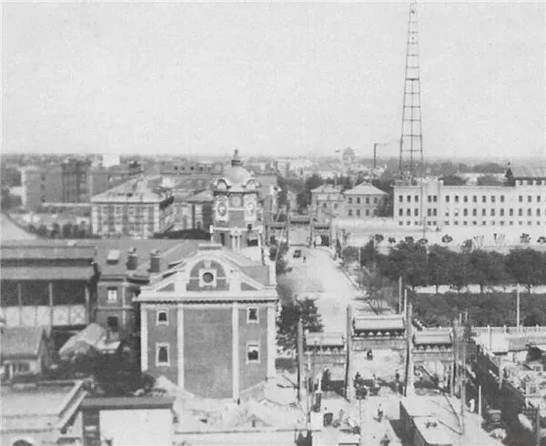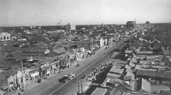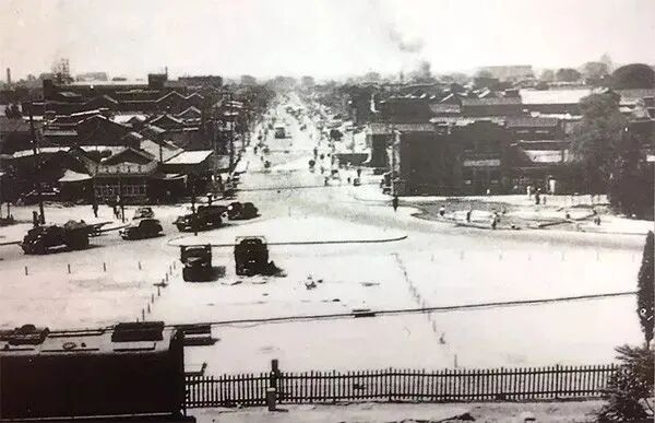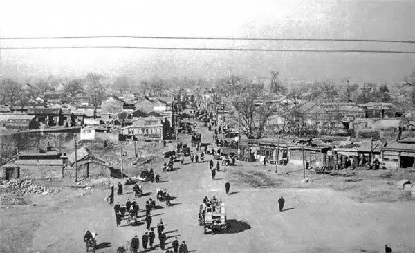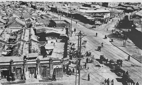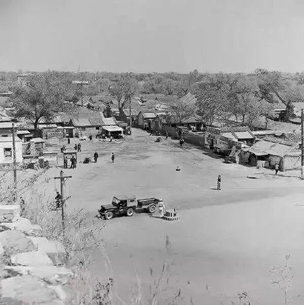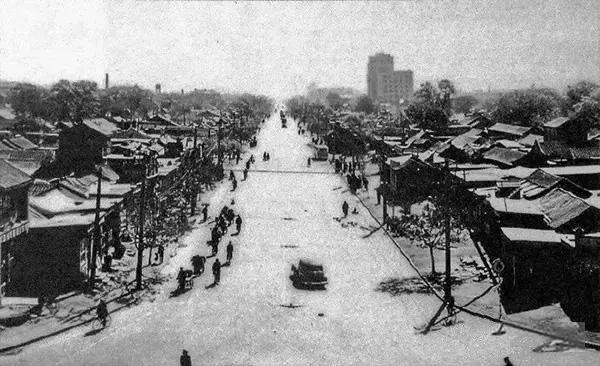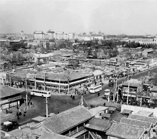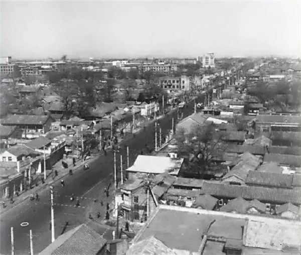 1951年,崇文门内大街东交民巷东口,由城楼上向北拍摄,左边的建筑是老同仁医院,远处的高大建筑是德国医院,现即北京医院。