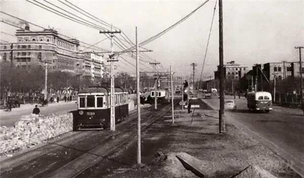 1951年,长安街天安门前。由电车公司修造厂仿制的法国100型机车及200型拖车成功,国产的有轨电车上路。