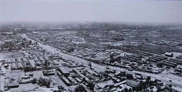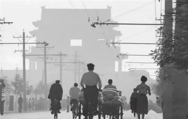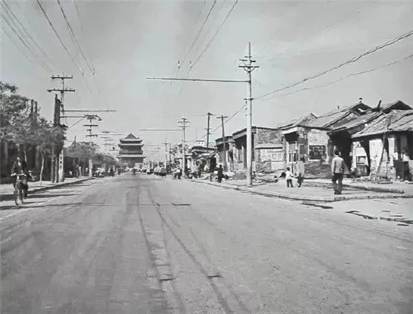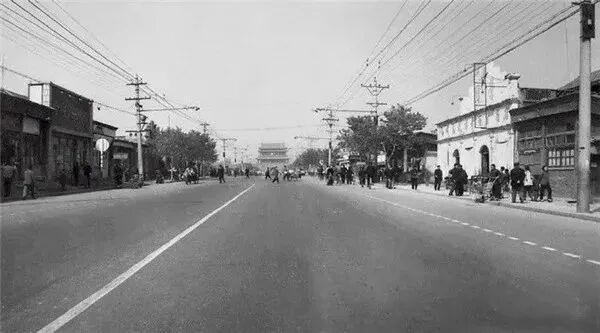 1952年,阜成门内大街。历代帝王庙前“景德街”牌楼与远处的阜成门城楼映衬出的美妙景象。梁思成赞此景在夕阳时观览,景致佳妙。可是好景不长,两年后牌楼就被拆除。