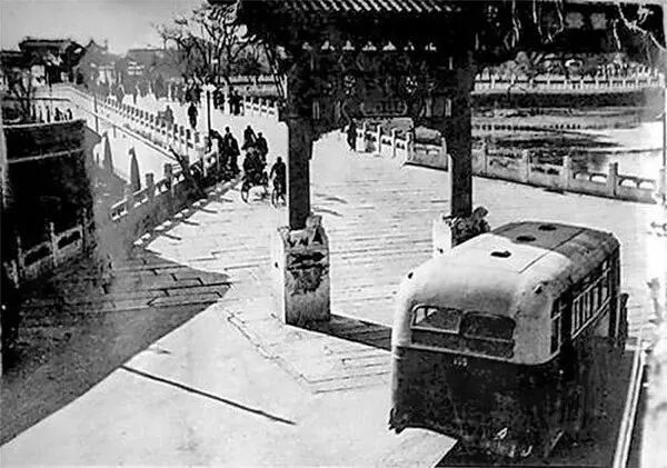 1953年,金鳌玉蝀桥,“玉蝀”牌楼下2路公共汽车驶过。