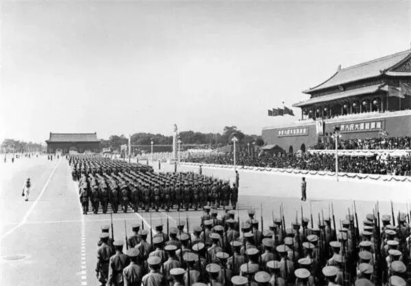 1950年,建国一周年国庆阅兵。步兵方阵通过天安门前,