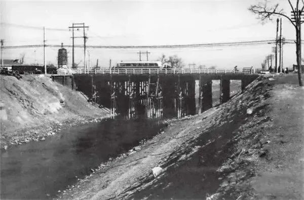 1953年,广安门护城河桥(北向)。可见天宁寺塔,桥上的公共汽车是1路,从广安门开往安定门,过桥右拐是终点站,后来是4、9路无轨电车站。