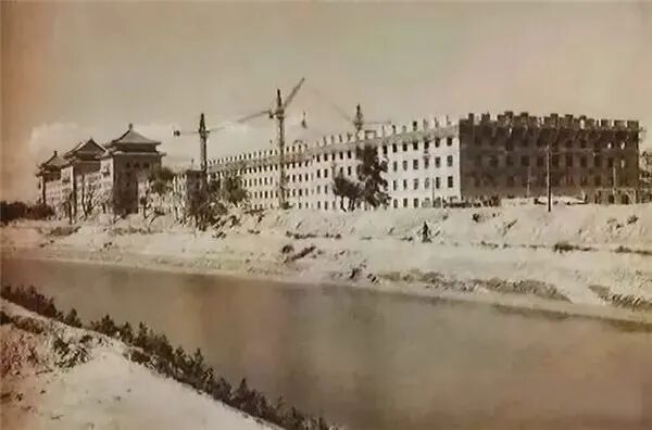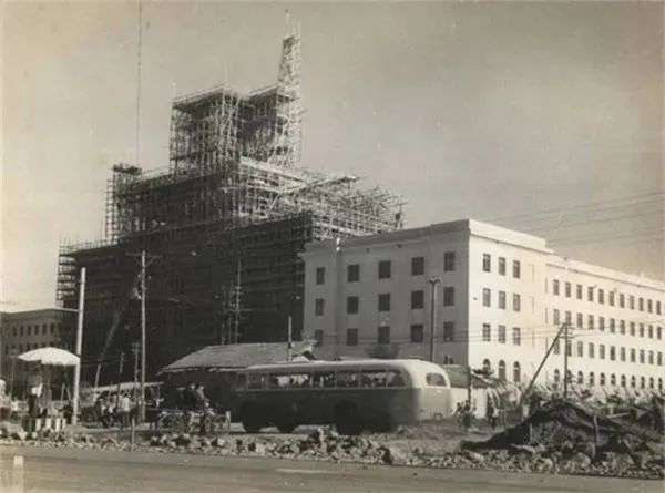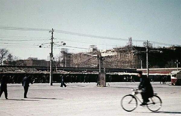 1950年,长安右门西长安街,正在修建外金水河南面的简易观礼台。可见大理院建筑,此时已为高法和高检接管使用。