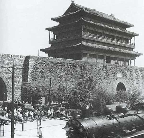 1952年,崇文门城楼西南面(西券洞铁道口)。崇文门城楼屋面蒿草茂密,已显破败。瓮城于1950年拆除,为便利交通,在城门西侧城墙上开辟了一个券洞,城墙新修补的痕迹尚在,火车头正穿越原瓮城双向铁路券洞(闸楼)位置。