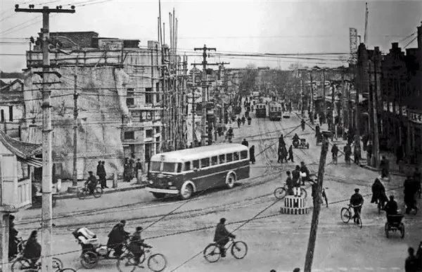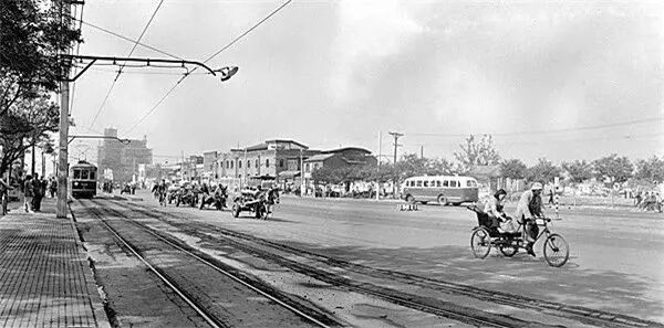 1953年,西单路口东向。西长安街还未展宽(1954年启动西长安街改造),远处可看到庆寿寺双塔还在,南侧可看到长安大戏院的牌子。向北拐弯的公共汽车应该是3路(还行线,匈牙利伊卡璐斯60型),在西长安街上行驶的是当当车。