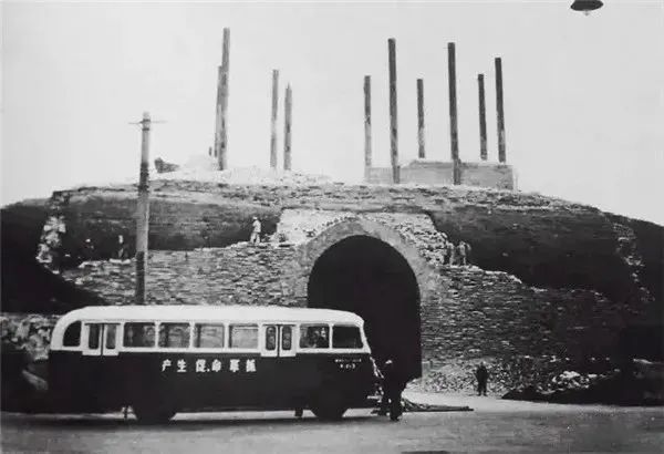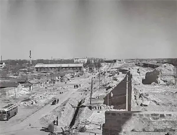 1969年,西直门城楼东面(城里),城楼已拆没了,城台上仅剩下10根柱子。城台已扒了皮,工人还在扒着。公共汽车上喷着“抓革命,促生产”的时代标语。