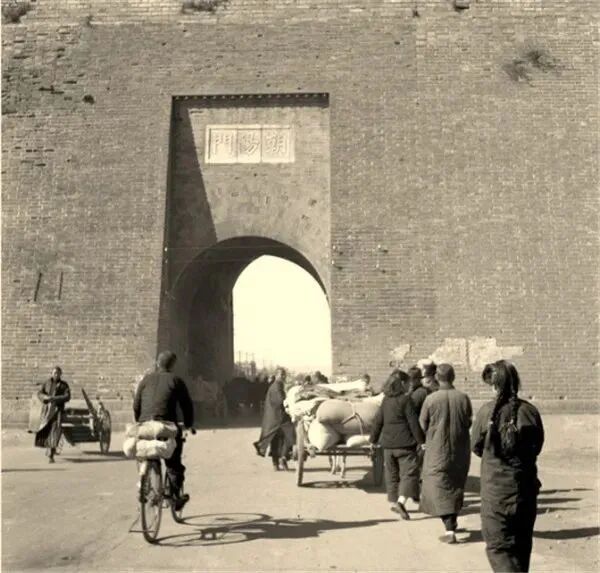 1951年,朝阳门城楼东面城门洞前,城门石匾“朝阳门”三字历历在目。赶大车,骑自行车进城送货,以及进城的行人。