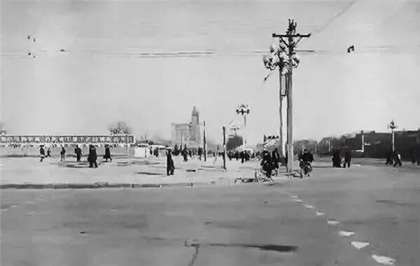 1954年,朝阳门内大街、猪市大街(1965年改东四西大街)东向,东四牌楼已拆除。外交部大楼正在兴建,再远处是朝阳门城楼。