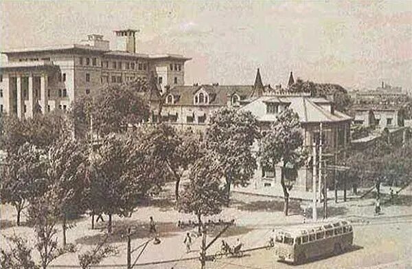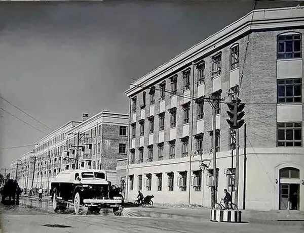 1953年,赵登禹路白塔寺路口北,帅府胡同(西四北二条)西口北京41中学(原北京平民中学)的教学楼。街道上行驶的是7路公共汽车,西郊公园(动物园)开往东单。
