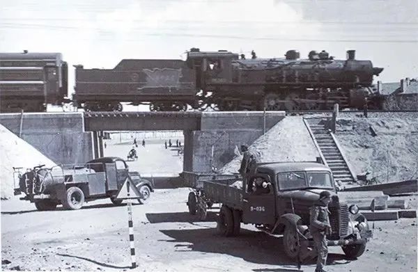 1952年,朝阳门城楼东面,环城铁路道口。公共汽车有刚从匈牙利进口的伊卡鲁斯(Ikaru)大轿车,还有老美的小道奇。