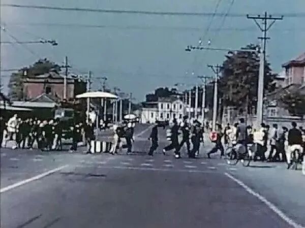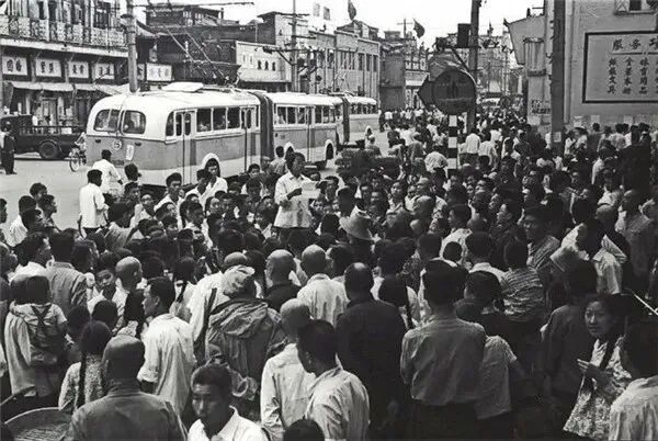 1966年,前门大街大栅栏东口。北京28中(运动起来后改东方红中学)红卫兵在街头宣讲传单。6路无轨电车经过前门大街。