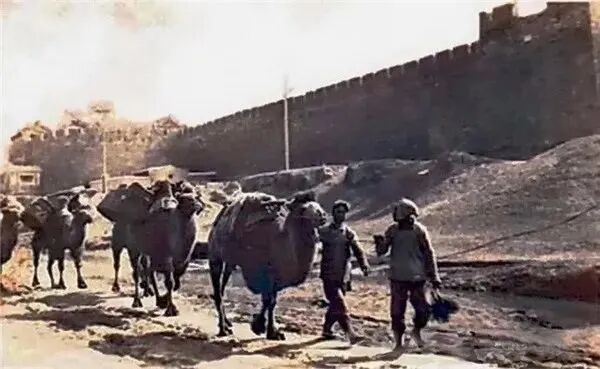 1950年,西便门瓮城以西外城北垣,以及西便门与外城西北角楼间唯一的墩台(马面)。顺护城河内沿儿西行的驼队。