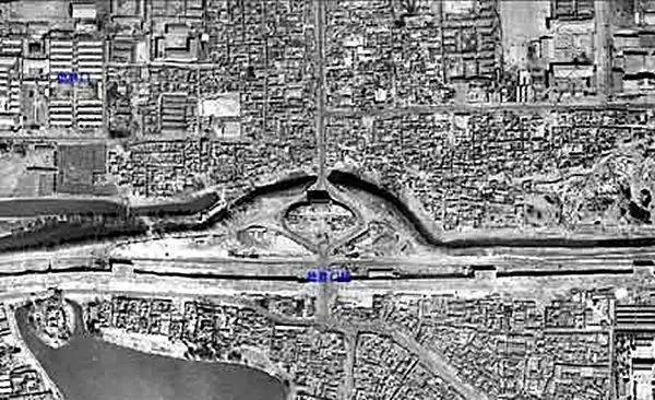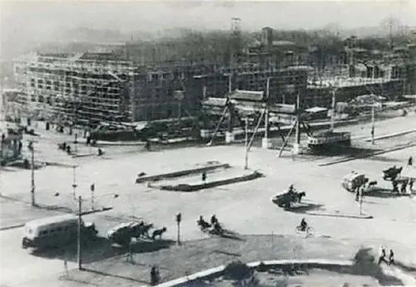 1951年,东长安街牌楼俯瞰,王府井南口、台基厂北口和东长安街的交叉十字路口,路口西南角是正在建设的燃料部大楼。