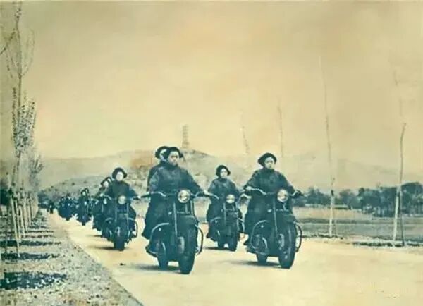 1952年,玉泉山路。新中国第一批女摩托车运动员,驾驶着国产“井冈山”牌摩托车在训练。