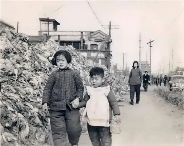 1953年,朝阳门内大街,冬储大白菜和街上未脱童稚的姐弟俩。