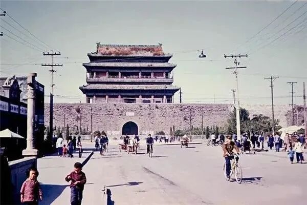 1961年,西直门箭楼西面,西直门外大街。街上有新出厂的上海581三轮轻卡,华沙20轿车。