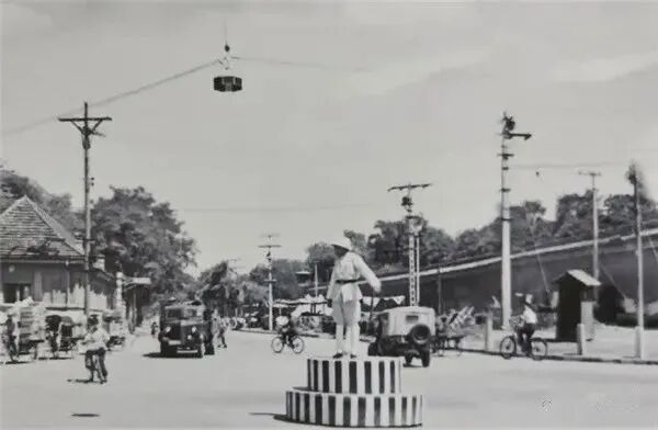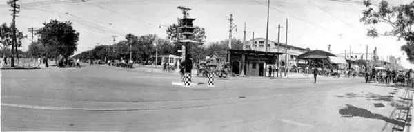 1960年,宣武门外大街、广安门内大街、骡马市大街交会菜市口丁字路口。警察阁子西是人民照相馆,阁子东是清真菜市口小吃部,即后来的南来顺饭庄,西北角是菜市口信托商店,东北角即菜百。