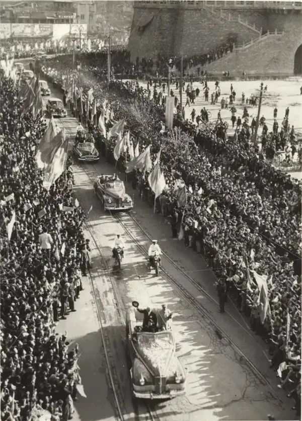 1952年,西长安街。国庆阅兵的坦克车队通过天安门广场后行进到中南海新华门前,前方是西长安街牌楼。