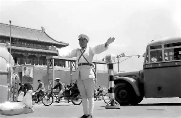 1950年,天安门前西皮市街北口外,交通警察在长安街指挥交通。