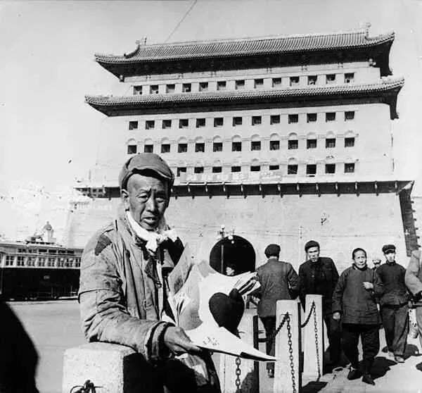 1953年,正阳门箭楼南面,兜售报纸的老人手拿《北京日报》。箭楼上有横幅“苏联电影节”。