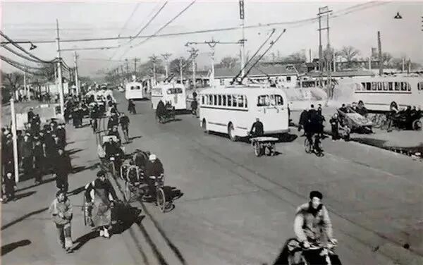 1961年,西直门外大街(铁道口),远处可见北京展览馆。西行的无轨电车是新西延的7路,开往白石桥。