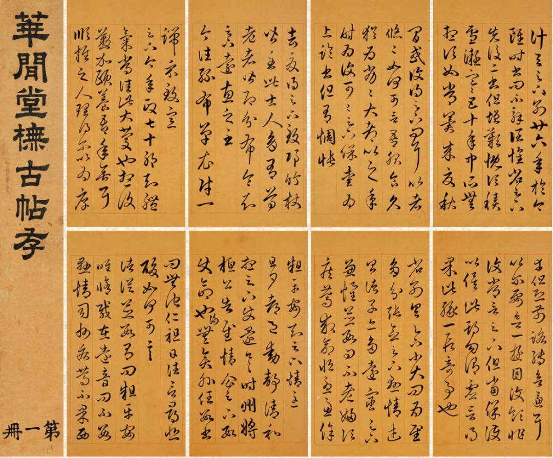 “花间堂”本为胤禧的堂号,慎郡王胤禧是康熙的儿子,从小就擅长诗词歌赋、书法画作,代表作有《紫琼岩诗抄》《花间堂诗抄》等,其禀性淳厚,生活俭朴,虽贵为郡王,但能礼贤下士,好学不倦,乾隆二十三年逝世,时年48岁。允禧无后,乾隆就把他的第六子永瑢过继给叔叔为孙,故“花间堂”因以袭用。爱新觉罗·永瑢(1744-1790年),号九思主人,又号西园主人。少时居圆明园碧桐书院,亦称碧桐书院阿哥。乾隆帝第六子,皇三子永璋同母弟,母为纯惠皇贵妃苏氏。乾隆二十四年十二月,出继慎靖郡王允禧,封贝勒,管理内务府、充《四库全书》玉牒馆总裁、监管钦天监事务。三十七年,进封质郡王。五十四年,再进质亲王。乾隆五十五年(1790年)去世,时年四十八岁,谥号为庄。他工诗、擅画,兼能天算,还是个喜欢藏书的人,有《九思斋诗钞》传世,其书法直可与其弟成亲王永瑆相提并论,在清代皇室中,亦可谓出类拔萃者。此《花间堂摹古帖存》共五册,虽题为摹古,实则法赵,即临摹《御刻三希堂石渠宝笈法帖》中收录的赵孟頫书作品。《御刻三希堂石渠宝笈法帖》是清乾隆十二年(1747)宫廷编刻的一部大型丛帖,共32册,刻石500余块(原石现在北京市北海公园),收录了 自魏晋至明末135位历史名人、书法大家的300余件书法作品,其规模之大,收罗之广,镌刻、拓工之精,以往官私刻帖鲜与伦比。第一册为临赵孟頫临《右军帖》、《定武兰亭十三跋》;第二册为临赵孟頫书《文赋》;第三册临赵孟頫书《尚书·无逸篇》、《纨扇赋》、《归去来并序》、《卫淑媛墓志》;第四册临赵孟頫《与山巨源绝交书》;第五册临赵孟頫《楷书千字文》、《朱子感兴诗》。其书临写赵吴兴,形神兼备,遒媚秀逸,几可乱真,且煌煌巨制,保存完好,其华贵雍容之气,寓于其中。