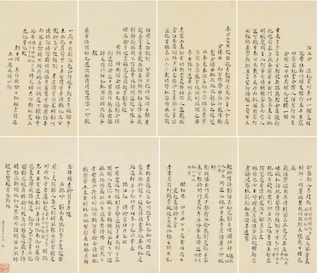 此册是何绍基抄录自作词十五首,未署年款,俱为小楷誊写,一丝不苟,极为精秀雅致。查钱松《何绍基年谱长编》,有“此年(1856)冬填词多首,并与嵇春源、李仲蘅等人讲求词律。如《贺新凉》云:旅居寂寂,忽想填词,嵇春园山长见示万红友《词律》,阅其凡例,知与我同一门外也,漫填二阕请教。其《金缕曲》亦云:仲衡谱《金缕曲》见慰,劝令填词遣闷,余近日甫与仲衡、春园讲肄,未得门径也,辄用前调次韵奉报。与善化人余棨(芰香)多有往来。余氏多次馈筍,并送牡丹。”又“此月(1857年五月),曾寄济南家书。案:此信札原无标题,《何绍基黑迹》署为《致何庆涵家训》,今年何庆涵同行至京师,故《顾先生祠会祭题名弟一卷子》于今年顾亭林生日祭及秋祭中均有提及,《何绍基墨迹》之标题有误”。《自作词册》均抄录了以上诸词,多刊于《东洲草堂诗钞·东洲草堂诗馀·东洲草堂文钞》,清同治六年(1867)长沙无园刻本。且册后有“五月七日书于三弟”的记录,故将此册创作年代定于填词时间(1856年冬)之后,寄济南家书同时,即1857年五月较为合理,而《何绍基黑迹》署为《致何庆涵家训》信札,标题当为《致何绍祺函》。