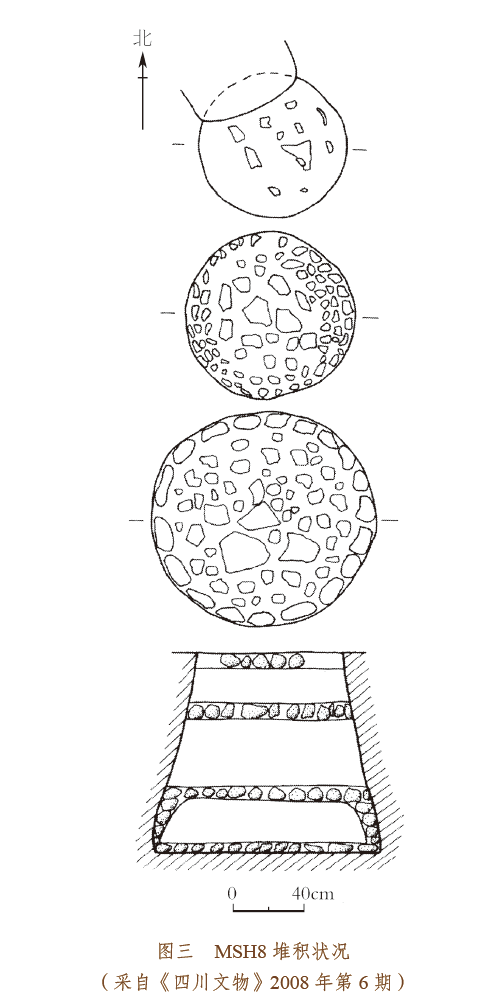 在SSJ、JMJ两个祭祀区内还有大量祭祀遗存,根据目前发表的资料,除了不见丁类堆积状况以及只见于SSJ六座大坑的丙类堆积状况外,其余两类堆积状况均较为常见,如SSJ的小型圆形坑以及JMJ的L13,其堆积状况就属于乙类,JMJ的L4、L6和L8的堆积状况显然属于甲类。