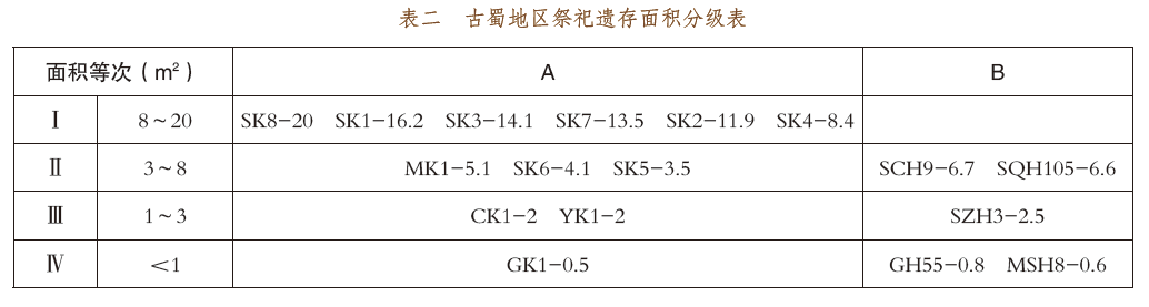 卯类 MSH8的埋藏文物同样残为碎片,分别规整地铺在各层堆积中,可以拼对复原,显然也是有意破坏,不过是先破坏再埋入坑中,而非埋入坑中再破坏。除此之外,CK1、GK1、SK6以及JMJ的L8等祭祀遗存中发现明显的朱砂使用痕迹,且多见于坑底或“木箱”等大型容器内侧。YK1的部分石璧表面呈红色[41],或许与使用朱砂有关,而SSJ的几座大坑中出土多件器物表面也发现沾染朱砂,可见使用朱砂应该是祭祀活动中的普遍现象。综合对比平面形状、堆积状况、文物埋藏与保存状况三个方面的特征,可以将古蜀地区祭祀遗存分为六大类(表三)。第二、三类祭祀遗存数量较多,面积大小和埋藏文物多寡都有所区别,据此可将二者各自分为四个和三个等级(表四)。第一类祭祀遗存无论是面积大小还是出土文物的种类、数量均明显优于其余五类祭祀遗存。第四类祭祀遗存CK1面积约2平方米,属于第Ⅲ等级,出土有铜牌饰3件、玉瑗8件、玉箍形器1件、玉凿1件、石璧21件、石斧3件,其等级大致对应于第二类的第Ⅱ等级和第三类的第Ⅰ等级。第五类祭祀遗存MSH8面积仅0.6平方米,出土文物除陶器之外别无其他,显然对应于第三类的第Ⅲ等级。第六类祭祀遗存ZK1和ZK2若按陶缸面积来算,应不足1平方米,但出土文物为铜器,其中尊、罍、觯等容器数量较多,仅不见金器、玉石器等,故其等级大致对应于第二类第Ⅱ等级。如此,目前所见祭祀遗存可综合划分为六个等级(表五)。![]()