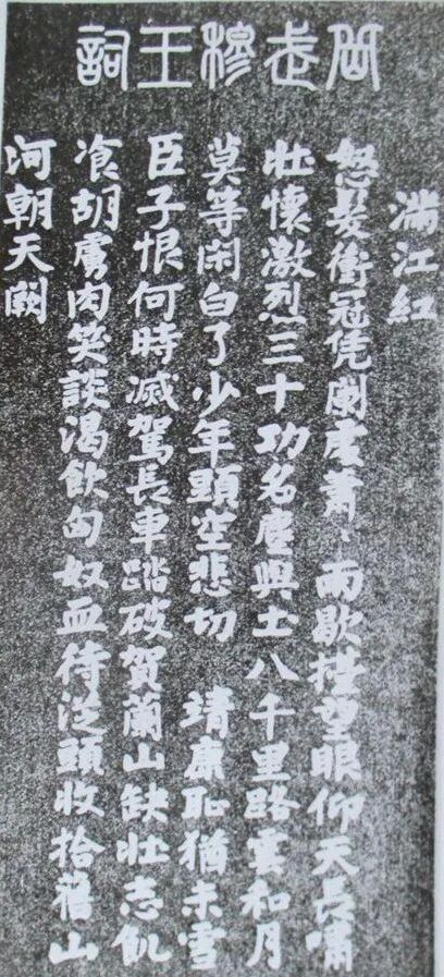 在岳飞家乡河南汤阴县的岳庙中,矗立着一块刻着岳飞《满江红》词的石碑。此碑汤阴本地人1981年发现,是明代庠生王熙于明英宗天顺二年(1458年)书写,石碑上明确地写道:“右《满江红》词,乃宋少保岳鄂武穆王作”。