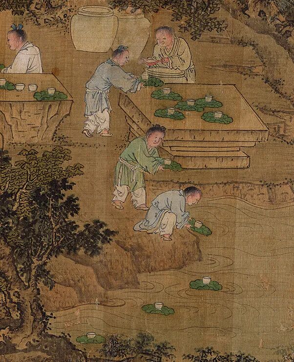 在上游的岸洞中存有一些酒坛,侍仆正执壶往酒杯中斟酒,然后将酒杯放在类似荷叶的盘中,再将其置于水面,盘杯顺溪水漂流而下。沿溪流两岸分坐四十二贤士,每人有一褥垫席地而坐,并置笔墨纸砚于旁,以进行曲水流觞活动。酒杯顺流而下,停在谁面前谁即取饮赋诗,若赋诗不成,便罚酒三杯。