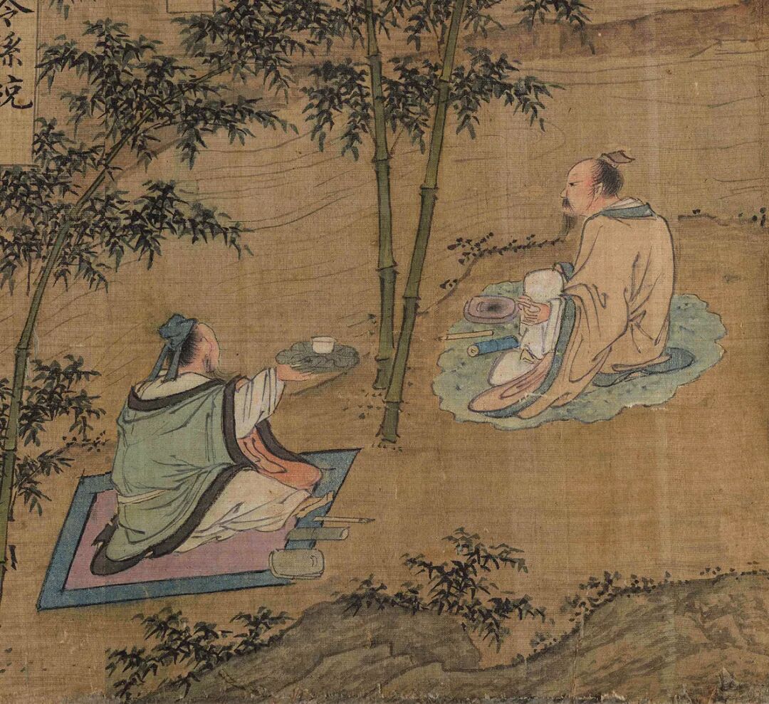 老竹下二人,一年迈屈膝弃卷而憩,一临流而探杯。