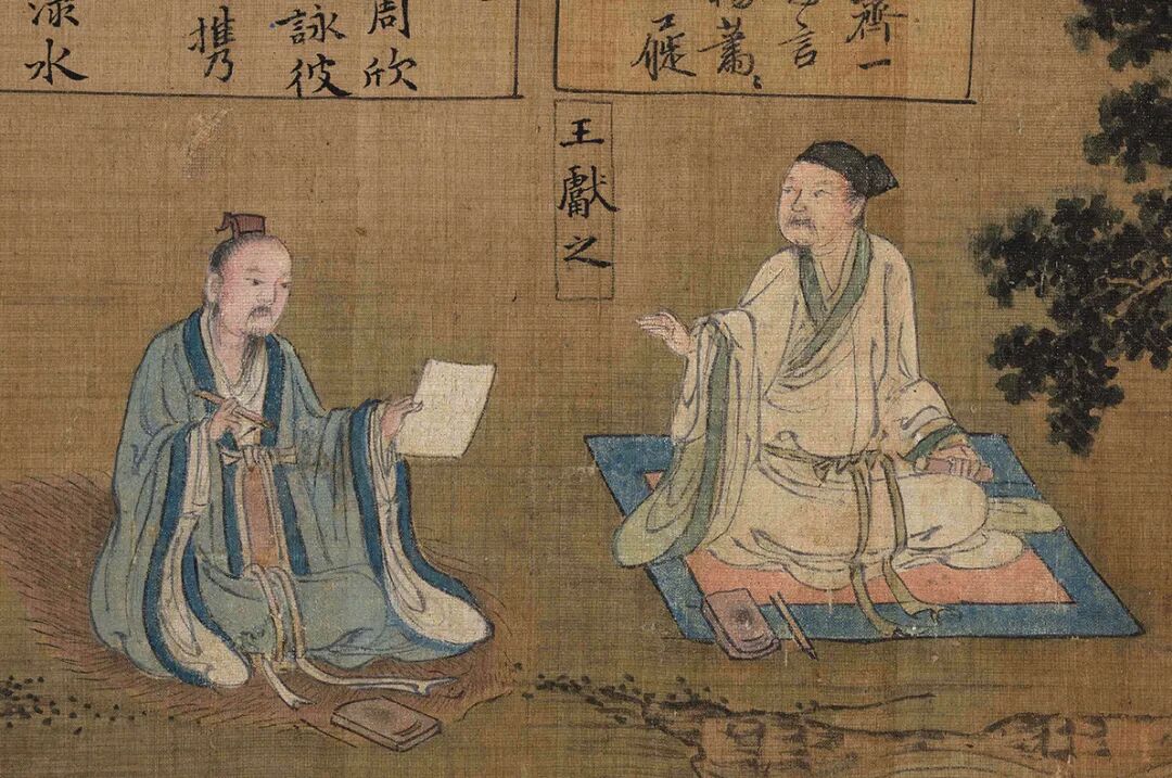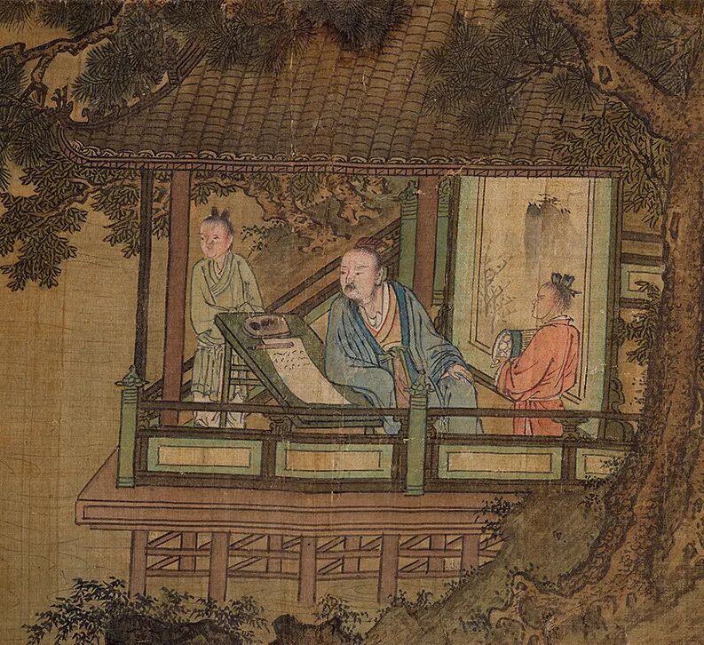 松下二人,一撚髯而问,一凝卷而听。岩傍一人,神倦而伸。涧右一人,一人举卷,一手握笔按膝。